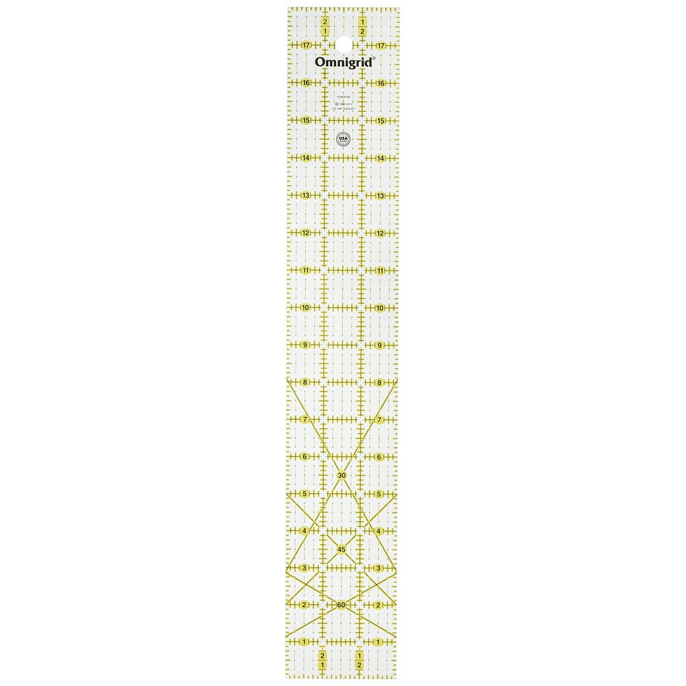 • This ruler was made from a durable premium quality acrylic plastic and laser cut for a smooth edge that allows for easier deeper cutting of fabric layers. The patented double line effect is printed in black and yellow which allows the used to see the grid on both dark and light fabrics. Designed for left and right handed users. Used for sewing; scrapbooking; crafts; weaving and more. Has 30; 45 and 60 degree angle lines marked for easy alignment of fabric. This Ruler measures 3 by 18-inch. Made in USA.