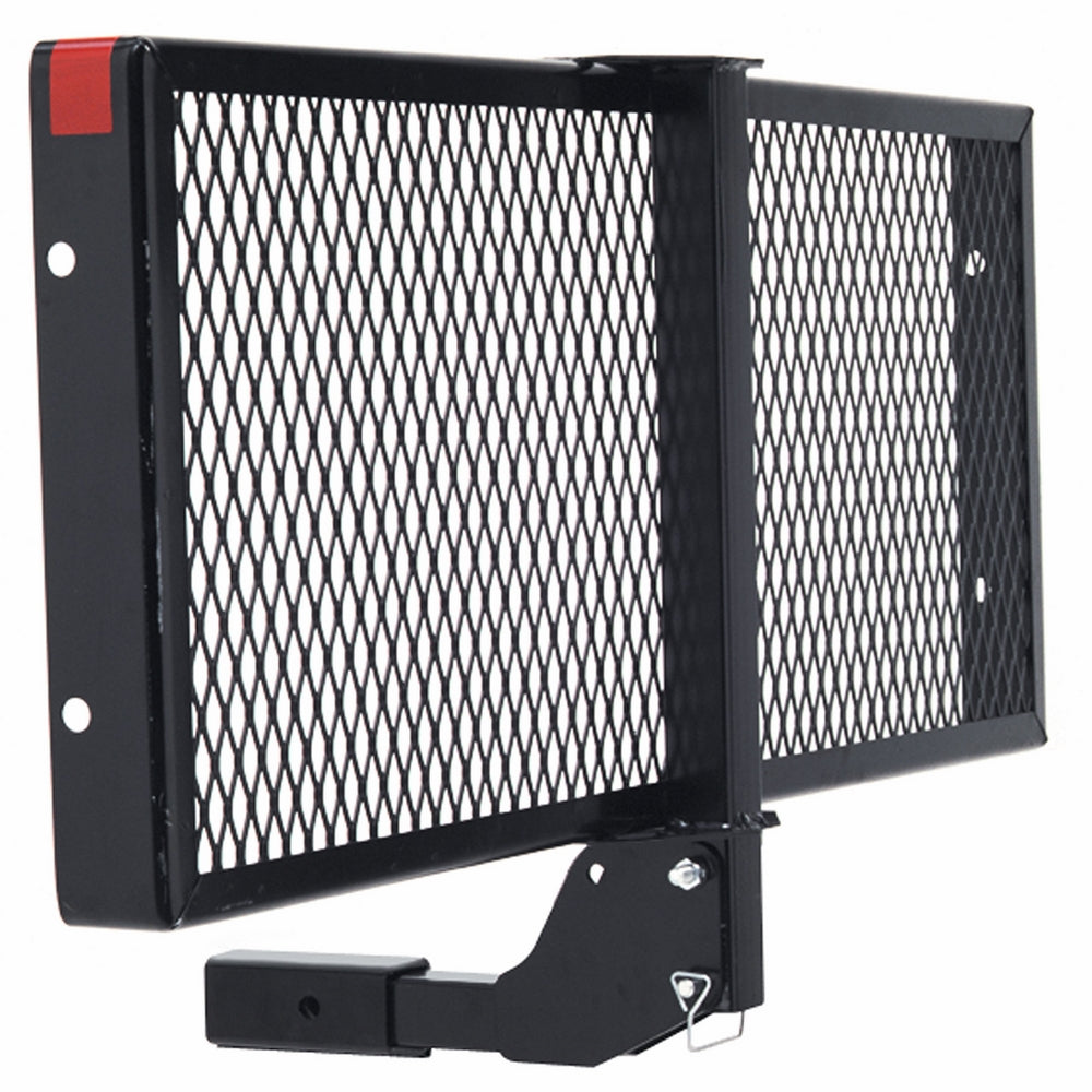 • The high capacity Pro-Series StrongArm Hitch-Mount Folding Cargo Carrier holds up to 500 lbs. and frees up space in your vehicle to pack coolers, bikes, camping gear, bags, and any equipment that can be loaded up and strapped down. With an adjustable, folding arm, this platform can be folded upright for easy parking and maneuvering when not in use. Securing your items in place is simple with the addition of 3” side rails and easy-connect holes for attaching straps or cargo nets. A unique rise-shank design offers greater ground clearance, and fits 2” receivers on cars, trucks, SUVs, vans and other large vehicles. This heavy-duty trailer hitch accessory is built to last with a black powder coating that helps protect against the elements and resists rust and scratches. The smart, rugged mesh floor also allows for quick and easy clean-up. Whenever you're ready for an adventure, this smart storage solution is perfect for camping, road trips, outdoor activities and other excursions.