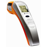 Recent advances in optics make this technology more accurate and cost-effective. Just aim the IR Thermometer at the target, press a button, and read the temperature display. The device has an optical lens that collects the radiated infrared energy from the object and focuses it on the detector. The detector then converts the energy into an electrical signal that's amplified and displayed as a temperature reading. An infrared thermometer measures temperature by sensing the magnitude of radiated energy at infrared frequencies. Using this data and the actual temperature of the detector, the thermometer calculates the temperature of the surface that emitted the energy.