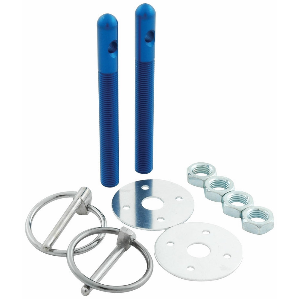 Brand Allstar Model ALL18482 Color Blue Size 3/8in Hood Pin3/8 x 3-1/2 in Long1-1/2 in Diameter Scuff PlatesKits include two each - 3/8 inch diameter aluminum pins, aluminum scuff plates, flip over style 3/16 inch diameter steel clips and four nuts. Clip flips over stud and locks into place. Over-center...