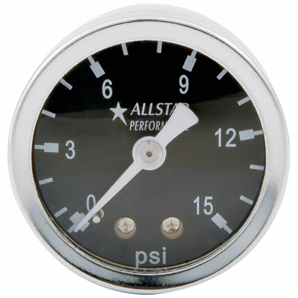 Pressure Gauge0-15 psiMechanicalGauges are 1-1/2 inch diameter with stainless steel cases and bezels. Available glycerin-filled, dry, or engine turned with brass internal parts and 1/8 inch NPT connections on back.
