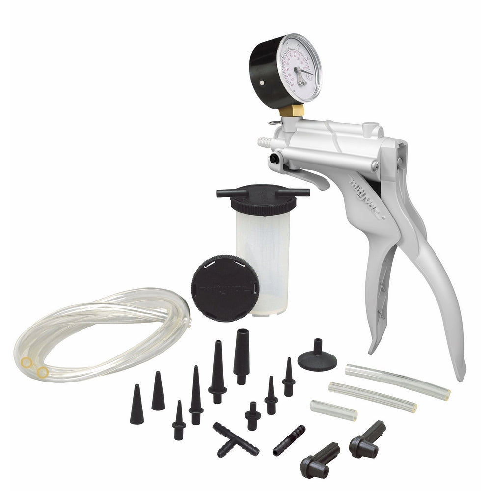 Universal Vacuum Pump for All Kinds of ProjectsHand-Held for Easy UseComplete with AdaptersInstruction ManualThis vacuum pump/tune-up and brake bleeding kit is a hand-held vacuum pump performs brake bleeding and tests many Automotive systems, such as Vacuum Gauges, Diesel Valves, Power Brakes, Ignition Timing, Vacuum Pumps, Engine Control Systems, Automatic Transmissions, Emission Controls, A/C and Heater Controls, Carburetors and many more. Complete with adapters, hoses and instruction manual. California Prop 65 - Warning, This product contains chemicals known to the State of California to cause cancer, birth defects or other reproductive harm.
