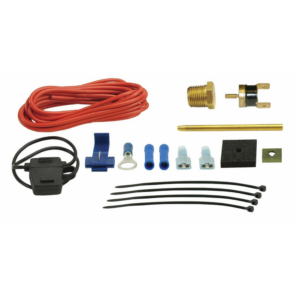 180 degree farenheit preset turn-on temperatureTurn-off temperature is preset at 165 degree FarenheitUniversal kit includes both 3/8 inch NPT thread-in probe and push-in radiator probeRated at maximum 15 amp continuous drawThis universal 180 degree F-on/165 degree F-off electric fan thermostat kit is designed to activate 1 fan with a maximum draw of 15 amps. Includes both a push-in radiator fin probe as well as a water jacket 3/8 inch NPT thread-in probe. Includes wire and electrical connectors for an easy installation.