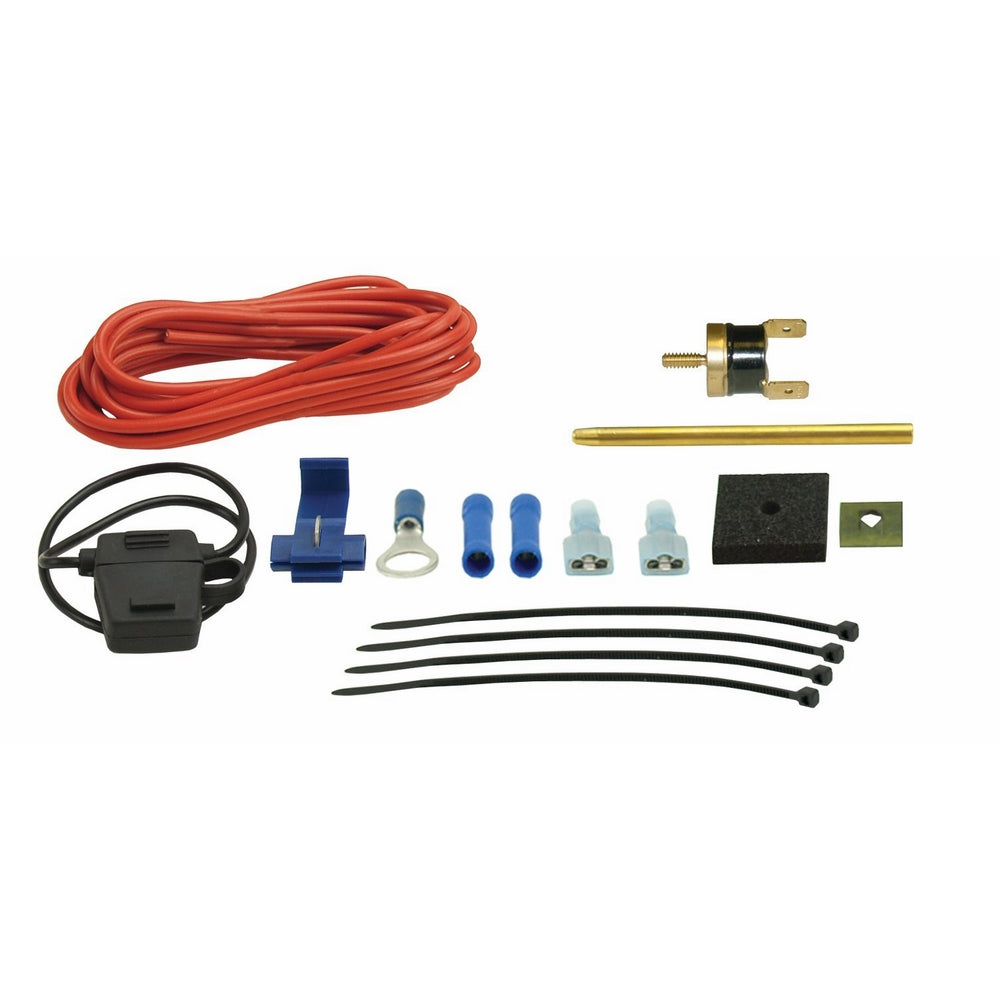 180 degree farenheit preset turn-on temperatureTurn-off temperature is preset at 165 degree FarenheitPush in radiator probeRated at maximum 15 amp continuous drawThis 180 degree F-on/165 degree F-off electric fan thermostat kit is designed to activate 1 fan with a maximum draw of 15 amps. Includes a push-in radiator fin probe, wire and electrical connectors for an easy installation.
