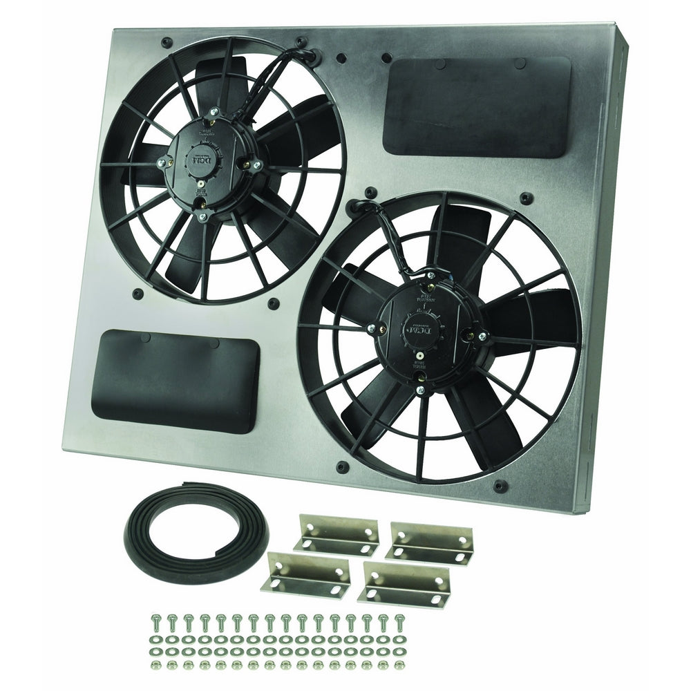• This Dual High Output Radiator Fan Assembly allows true Dual Fan performance in a package the size of others Single shrouded fans. Featuring an aluminum shroud measuring a tidy 22-1/2 inch wide by 19 inch top to bottom and only 4-1/2 inch in overall depth to offer an adjustable yet precision fit, it uses two IP-68 certified waterproof/dustproof 12 inch electric fans to provide a powerful one-two 3750 CFM punch to a hot engine. The natural, non-finished aluminum shroud gives the user the freedom to polish, anodize, paint, or simply leave it raw to create a truly custom look at a reasonable price.