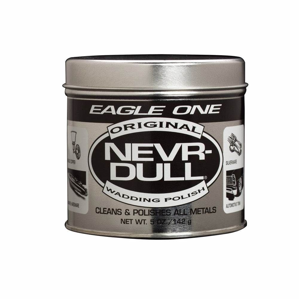 • Eagle One's Never-Dull Wadding Polish is a go-to metal polish for car guys for over 70 years. Nevr-Dull's proven mildly abrasive cotton wadding and cleaning solution can help to maintain the appearance of any metal surface, removing rust and tar with little mess and easy application. Just a little goes a long way.