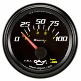 Black colored face with numbers in white; black pointer with black and white bezelGauge diameter is 2 1/16-in and reads from 0-100 PSISending unit is mechanical with 90 degree sweepBack-Lit illumination for night useGives advanced warning of incorrect oil pressure, low oil level, defective oil pump, restricted oil lines, clogged oil filter, and low oil levelThis black oil pressure gauge is engineered to provide extremely accurate readings under harsh conditions and measures the pressure of oil circulating through the engine. This oil pressure gauge has a 90 degree sweep, 0-100 PSI range, and has a backlit dial face with Boudon tube meter movement. Air core movements and simple three wire installation are also included. This gauge is easy to hook-up and mount in your car and gives an advanced warning of incorrect oil pressure, low oil level, defective oil pump, restricted oil lines, clogged oil filter, and low oil level.
