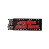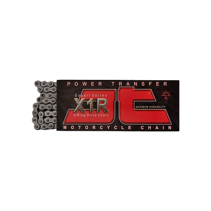 The JT X1R heavy duty X-Ring motorcycle chain is engineered for maximum durability and strength offering a high performance in both road and off-road useX-Ring seals are used for a better seal and produce less friction than conventional O-ring chainsManufactured using leading edge technology and with only the highest grade of special steel alloys, JT advanced power transfer chains meet or exceed the requirements of all modern motorcycles, street, MX, Enduro, off-road, and ATVJT X1R Heavy Duty Chains are constructed with quad riveted pins for an extra strong rivet that resists powerful lateral forces on the outer plateThe JT X1R heavy duty X-Ring motorcycle chain is engineered for maximum durability and strength offering a high performance in both road and off-road use. X-Ring seals are used for a better seal and produce less friction than conventional O-ring chains. Manufactured using leading edge technology and with only the highest grade of special steel alloys, JT advanced power transfer chains meet or exceed the requirements of all modern motorcycles, street, MX, Enduro, off-road, and ATV. JT X1R Heavy Duty Chains are constructed with quad riveted pins for an extra strong rivet that resists powerful lateral forces on the outer plate. Specifications: Roller Diameter: 10.22 millimeter; Pin Length: 24.9 millimeter; Plate Thickness Inner: 2.4 millimeter; Plate Thickness Outer: 2.4 millimeter; Weight per 100 links: 4.59 pounds; Average Tensile Strength: 9260 lbf; No. of Pin Rivet Presses: 4; Master Link Type: Rivet.