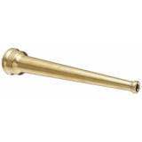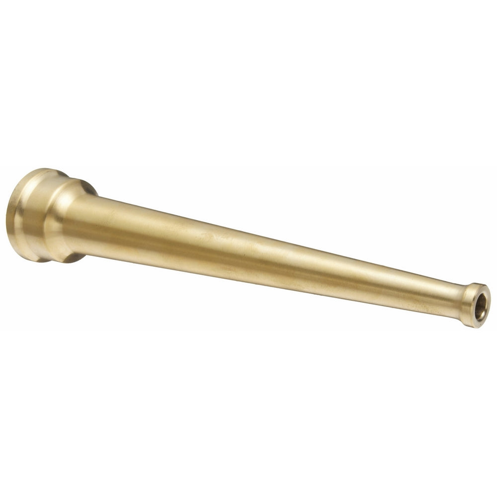 This Moon 572-1011 nozzle is an 8" industrial fire hose nozzle. It has a 1" National Pipe Straight Hose (NPSH) threaded inlet for attaching to a fire hose. It has one-piece brass construction for corrosion resistance, ductility at high temperatures, and low magnetic permeability. It has a 5/16" orifice for creating a solid stream of water and a maximum pressure rating of 100 pounds per square inch (psi). This nozzle is suitable for use with fire hose racks and reels and for other industrial applications where shut off valves are not required at the nozzle.