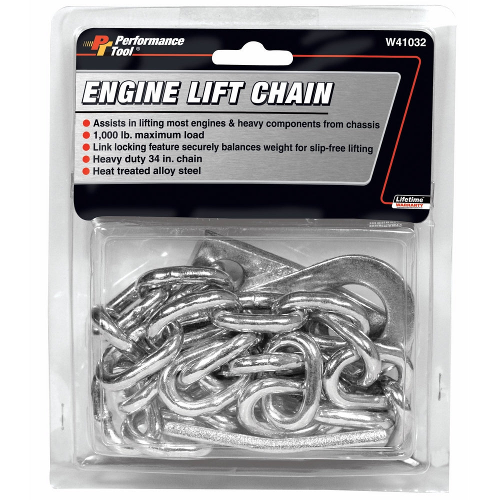 Brand Performance Tool Model W41032 Size Engine Lift Chain Assists in lifting most engines & heavy components from chassis1,000 lb. maximum load34" chain 37" overall length.link locking features securely balances weight for slip free liftingHeat treated alloy steel.Assists in lifting most engines & heavy components from chassis. 1,000 lb. maximum...