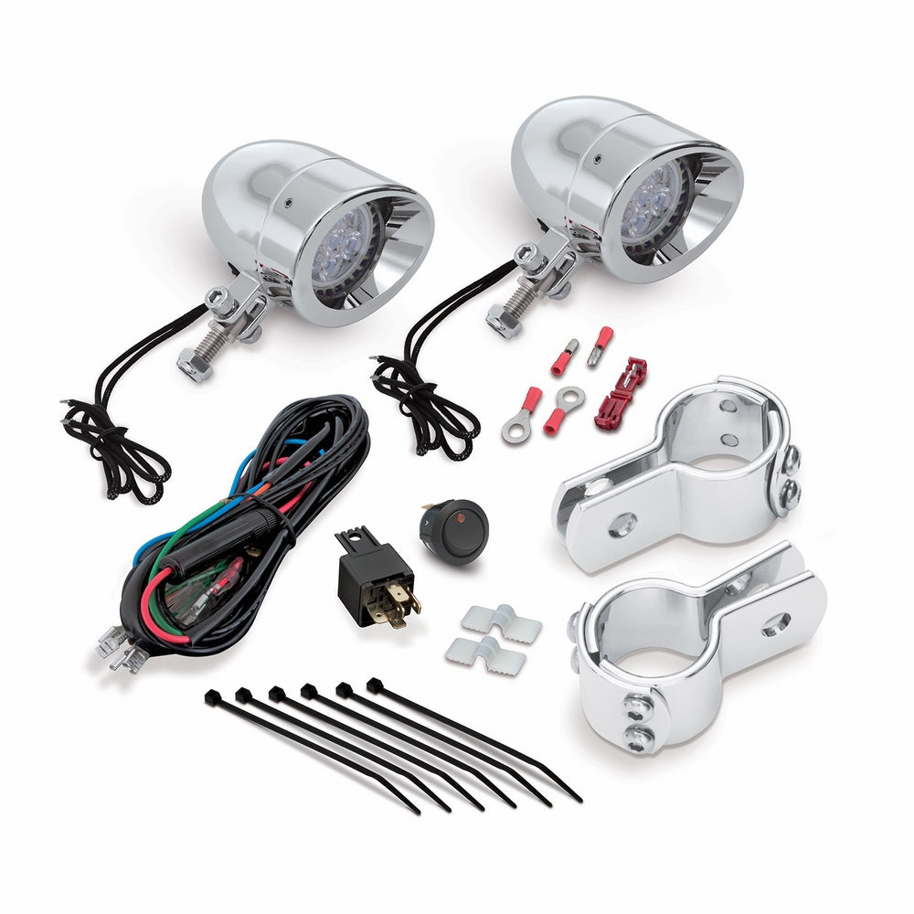 • This Mini Driving Light Kit comes with die cast 2 3/8'' visored lights and 1 1/4'' chromed highway bar clamps to help light up the road for increased visibility. This miniature LED reflector bulb delivers 400 lumens from its 12 volt 7 watt 6 LED output with a bright white 4000K color output. The concentrated beam angle of 20 Degree puts more light down the road for a true driving light capability. The die cast light has a built in visor and is only 2 3/8'' in diameter. This kit comes complete with wire harness and isolation relay to protect your bikes circuit along with switch. Universal fitment on 1 1/4" bars.