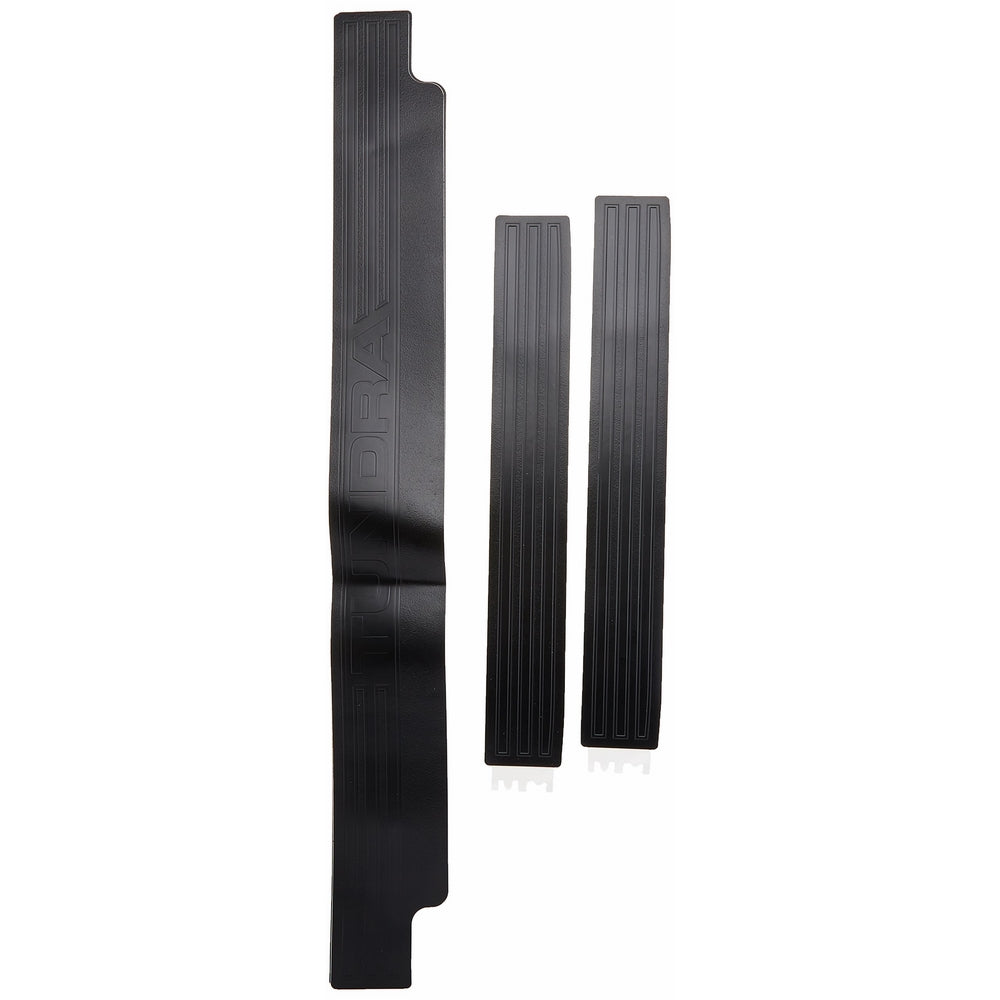 Durable black-molded door sills helps protect the vehicle's interior from everyday scuffs, scrapes and scratches.Custom-designed for a precision fit to the Tundra.Skid resistant surface."Tundra" name molded into the sill.Quick, simple installation.Keep your Tundra looking good with these door sill protectors that help guard against scuffs and scratches: Durable black vinyl construction with Tundra logo molded into the sill Skid-resistant surface