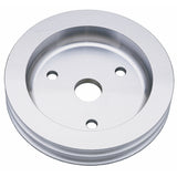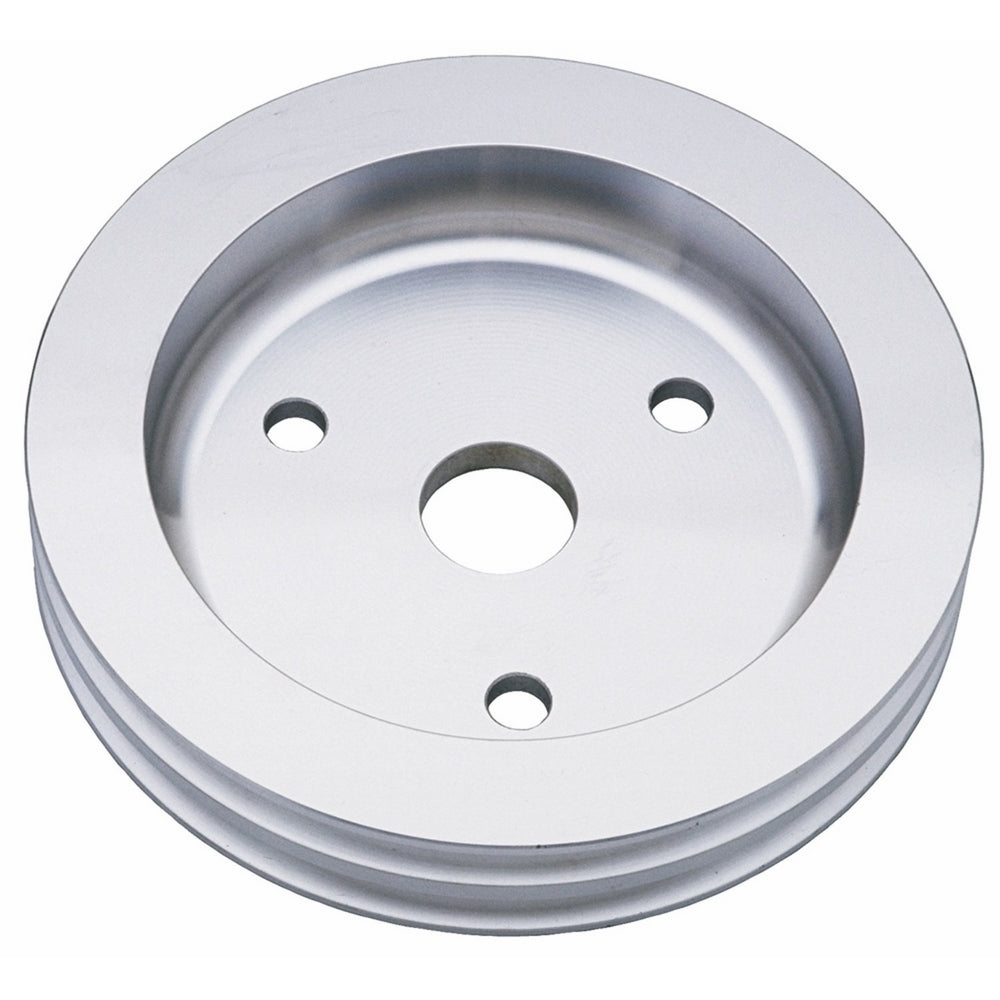 ALUM PULLY SB CHEVY55-68Trans-Dapt Performance Products chrome crankshaft pulleys are solid steel construction, and have a durable chrome finish. One, two and three groove pulleys are available for both long and short water pump applications. The bolt circle diameter on short water pump pulley is 1.75 inches, and 2.30 inches on long water pump pulleys. Chevrolet has made a variety of pulley diameters. We have chosen to use the most popular diameter for our pulleys. In some cases, the stock accessories may not run at exactly the same speed as originally designed. Although Corvettes have a short water pump through 1982, our short water pump pulleys will fit 55-74 only. Note: Due to the various casting configurations on aftermarket water pumps (especially aluminum pumps), exact fit can not be guaranteed on all applications.