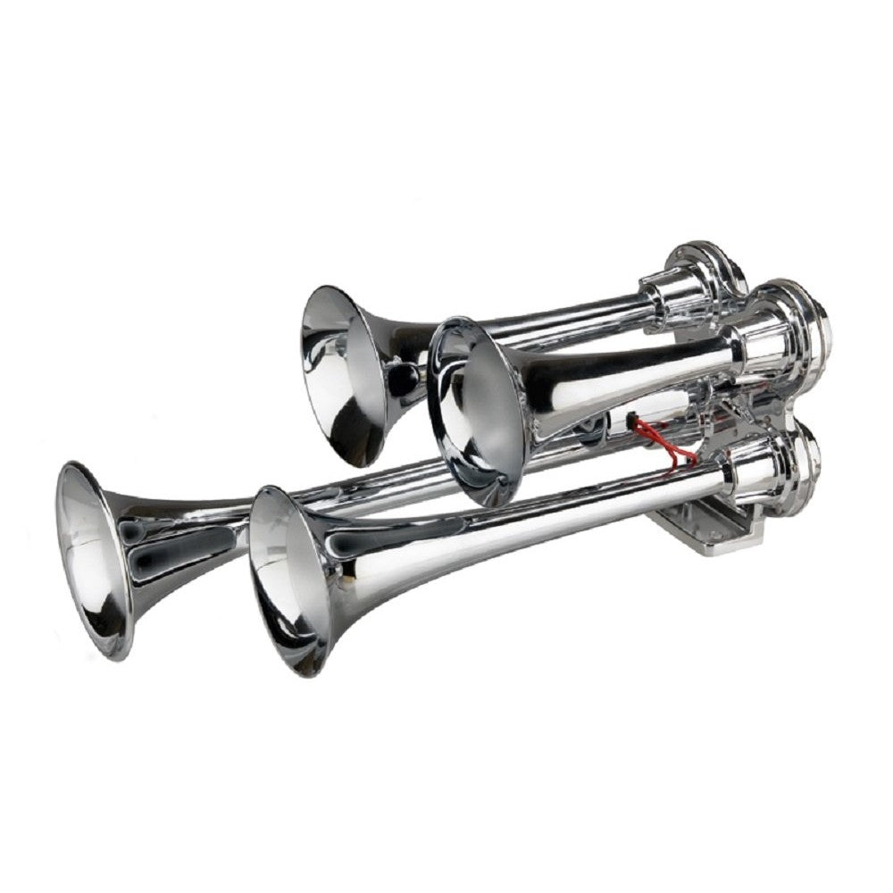 Will give any vehicle the powerful sound of a train air hornThe four trumpets and mounting base are metal triple chrome plated and designed smaller to fit into engine compartments that are unable to accommodate a full size train hornBuilt into the horns base is a heavy-duty, chrome plated 12/24-volt electric solenoid valveHorn comes with mounting hardware and instructions in English / SpanishRequires an on-board air system, (recommended Wolo on-board air system Model 800)