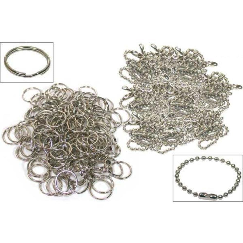 200 New Ball Chains & Split Rings This new set of 200 ball chains and split rings. These are perfect for making your own key chains. Each is made from nickel plated tempered steel for strength and durability. You receive: 100 Ball chains that each measure approximately 4" (102 mm) long and each ball measures about 2.4 mm (3/32") in diameter 100 Split rings that each measure approximately 24 x 2 mm (15/16" x 1/16")