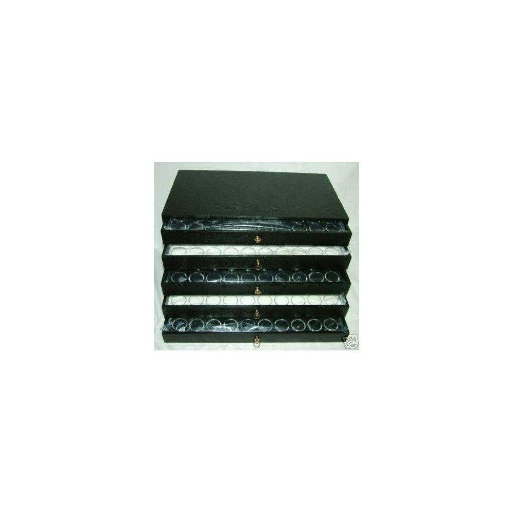 5 Drawer Jewelry Organizer Display Case 250 Gem Jars 5 Drawer Jewelry Organizer This is a new black 5 drawer jewelry storage organizer case Protect samples in storage and transport with this durable case Has 5 full size drawers that fit any full size insert or pad It measures approximately 15 1/8" x 8 3/8" x 7 5/8" (38.4 x 21.3 x 19.2 cm) 5 Gem Jar Tray Inserts This is a new set of 5 gemstone inserts. Each contains 50 removable clear plastic round jars. These will hold all of your loose stones, beads and coins. Each gem jar comes with an insert pad inside and lid. The inside diameter of each gem jar measures approximately 1 1/16" (27 mm). The insert measure approximately 14 1/4" x 7 3/4" x 3/4" (36 cm x 196 x 19 mm). You receive: 2 White inserts 3 Black inserts