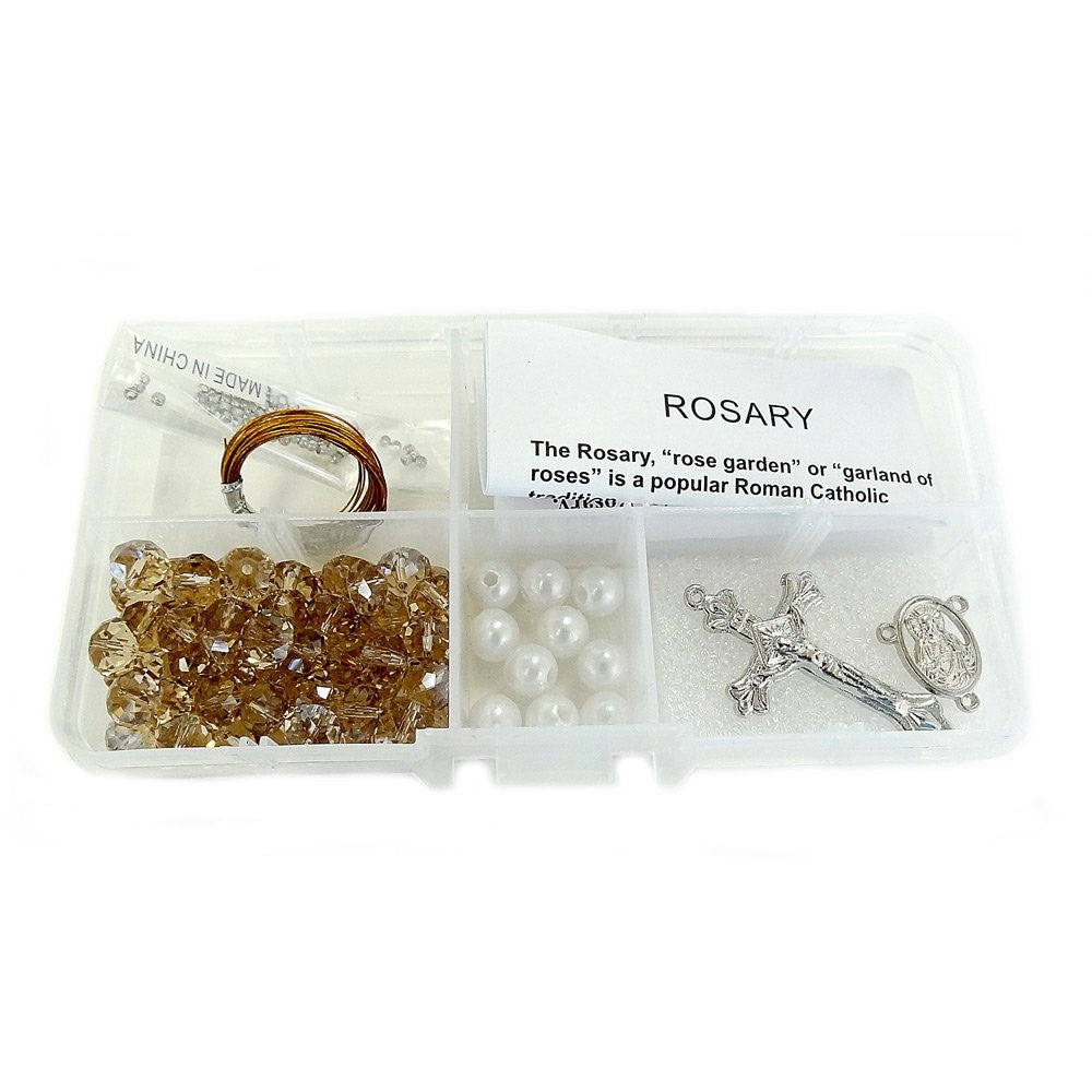 • Do it yourself. Rosary kit includes smoky faceted rondelle crystal beads, white pearl beads, crimping beads, spool of golden tiger tail beading wire, zinc alloy crucifix, zinc alloy centerpiece, an instruction in a plastic divider bead box.