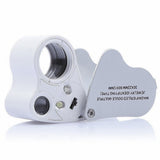 FOLDABLE POCKET MAGNIFIER GLASSES: for Jewelry Authentication, Jewelry, Rocks, Stamps, Coins, Watches, Hobbies, Antiques, Models, Photos IndustryDUAL LENS: Primary Lens: 30x 22mm, Supplementary Lens: 60x 12mm. You Can Choose Different Lens Freely, Random switchover, Meet your different needs.LED LIGHTING ILLUMINATED - Switch On/ Off for Bright White Led Light Convenient For See the Objects Clearly Under Insufficient Sunlight or Dark EnvironmentPORTABLE LIGHT WEIGHT - Foldable and tiny, great to have one in your pocket all the time. Optical glass lens provides clear view field, Folding metal cover protects lensPREMIUM DESIGN - EASY TO USE - Just Pull Out the Jewelry Magnifier to Use, and Put It Back When Not In Use. It Requires 3 LR1130 Batteries (Batteries is Included)