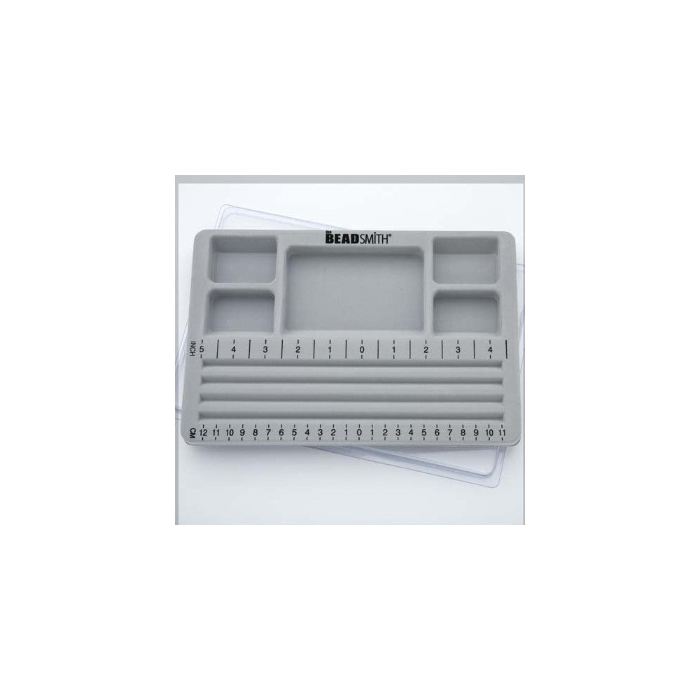 • Create your own unique pieces of jewelry using this great design board. It has a flocked surface to help prevent beads from rolling, recessed sections for sorting beads and findings, and features a removable cover so your project can travel with you. It has measurements in both inches and centimeters and each rectangular compartment has one slanted side for easy removal of components. This traveler bead board has specially designed channels that allow you to arrange jewelry projects. (7.75" x 11.25")