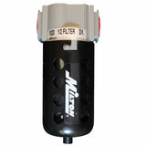 1/2" national pipe threadMaximum pressure of 250 pounds per square inchMaximum of 48 standard cubic feet per minute at 100 pounds per square inchInstall upstream from regulatorsCan be set up as a modular unit as wellMade in USAThis 1/2" NPT Milton micro filter is supplied with pre-assembled automatic overnight drain which will operate when an air supply is shut down or when liquid has gathered in the filter bowl. The included 3 stage baffle system offers exceptional moisture removal. This micro filter includes a porous bronze sintered 40 micron filter element which allows less pressure drops and longer cleaning intervals. Micro filters remove harmful water or oil condensate, pipe scale, dirt and rust from compressed air systems and are used as pre-filters to coalescing type filters to ensure high efficiency and long element life. This polycarbonate bowl has a bowl capacity of 5 ounces and is protected by a safety metal bowl guard. Maximum of 150 PSI and 48 SCFM.