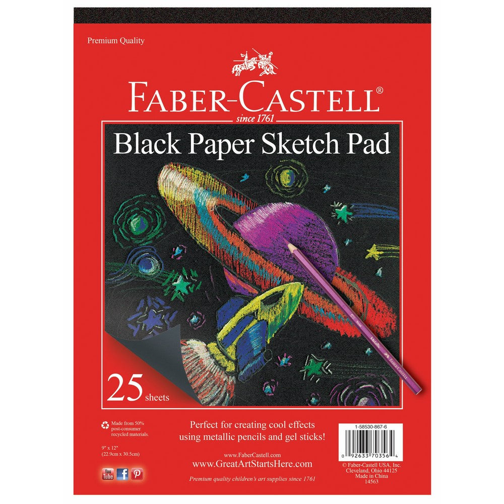 BLACK PAPER PAD - Heavy-weight paper in rich black works great with Metallic Pencils, Gel Sticks, Gel Pens, Oil Pastels, Gel and Beeswax CrayonsQUALITY PAPER - The black paper sketch pad includes 25 sheets of acid-free paper (9" W x 12" H).RECYCLED ART PAPER - This black paper sketch pad is made from 50% post-consumer recycled materials.GREAT FOR ALL AGES - Color and create vibrant art on rich black paper. This black paper pad is great for all ages.PREMIUM QUALITY ART PRODUCTS - See your arts and crafts projects come to life with the absolute best materials for young and adult artists alike. Faber-Castell has created premium quality art products since 1761.