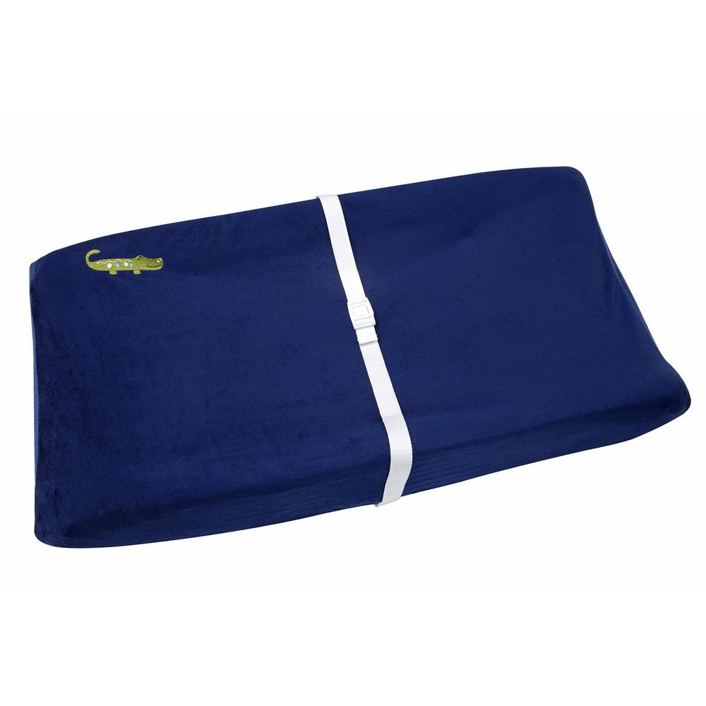 NoJo - Alligator Blues Changing Pad Cover. Soft velboa changing pad cover comes in navy with small embroidery of a happy smiling alligator in moss green. Fits a standard size contoured changing pad 32" x 16" x 6".