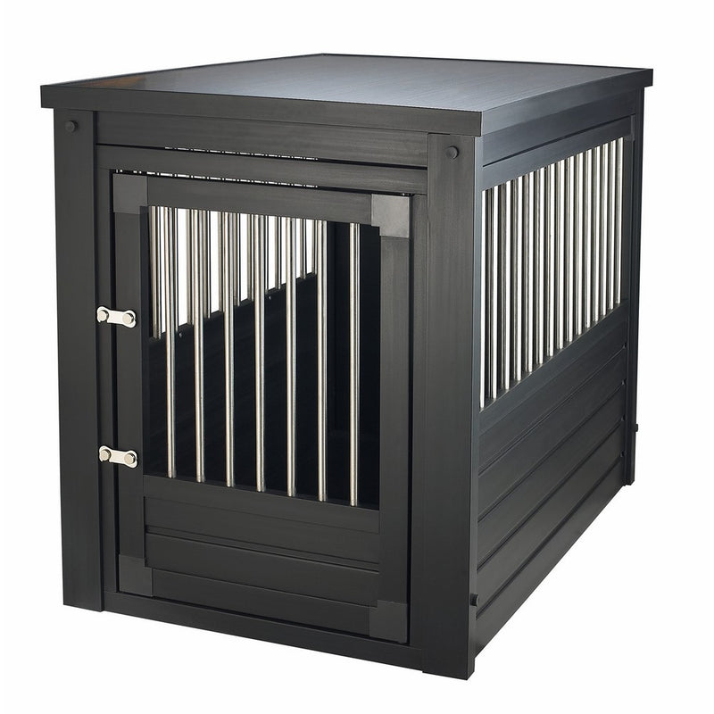 The ecoFLEX Habitat 'n Home InnPlace Pet Crate with Metal Spindles is the perfect crate for your pet while they are indoors. This stylish crate can pull double duty as an end table too. Made of durable non-toxic materials that is maintenance free as it will not crack, warp, absorb moisture and is easy to clean. Available in Russet, Espresso and Antique White. This easy to assemble crate is available in four sizes to accommodate all dog sizes. Double latches on large and XL models. 10 yr. Manufacturer's Warranty. Review dimensions prior to purchase.