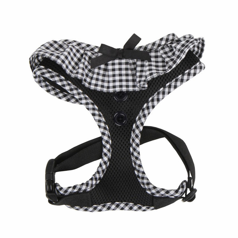 This is an Authentic Puppia Vivien Harness. Made out of the same polyester mesh that made our Soft Harness famous, this harness is breathable and features a checkered frills, with ribbons and buttons as decorations. Your pooch will look adorable in this harness.