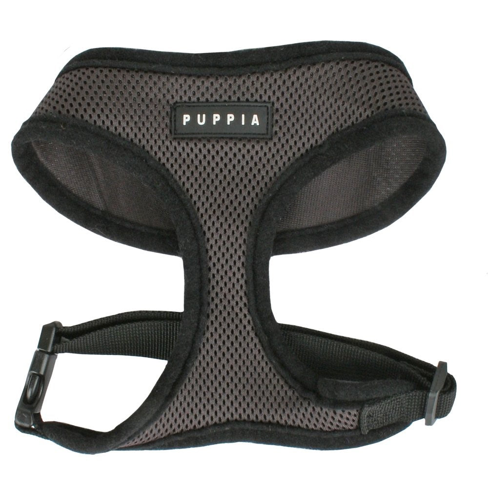 Authentic Puppia Soft Dog Harness made out of 100% Polyester. The size chart measurements are the dimensions of the actual product.Adjustable chest belt and quick-release buckle Comfortable padded neck opening. Make sure all measurements fit within the dimensions with a room to spare in the chest and neck. Please make sure neck measurement of your dog doesn't exceed measurement on the size chartMachine washable, but hand washing and air drying are recommendedIf you are looking for a harness that is adjustable around neck, and chest, we suggest trying a Puppia Ritefit Harness.See the pictures of dogs wearing Soft Harness at the bottom of page for your reference (7.5" neck girth / 9.0"13.0" chest girth)