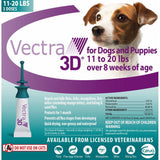 Vectra 3D protects your pets against parasites and pathogens. Vectra 3D uses a three pronged approach to keep your pet safe from disease carrying agents by utilizing Dinotefuran, Permethrin and Pyriproxyfen. The Dinotefuran is an insecticide that functions by causing continuous stimulation of the nervous system of insects upon first contact. This stimulation leads to tremors and quick deaths in insects as they land on your dog. Permethrin is an adulticide and works to repel vectors, such as mosquitoes, ticks and sand flies by causing them to lose control of their nervous system. Lastly, Pyripoxyfen, an insect growth regulator, works to prevent development of fleas in their early stages. This keeps them as eggs, larvae and pupae until the other active ingredients functionally decimate them. Vectra 3D has been clinically shown to provide fastacting protection against multiple pests lasting up to one month. In addition to repelling mosquitoes, ticks, and sand flies, Vectra 3D repels and kills fleas, lice, and mites quickly and effectively. In fact, it has been shown to reduce the number of ticks in only 24hours and begins killing fleas within the first two hours of use. Vectra 3D remains effective after bathing and it can be used on dogs and puppies older than 7 weeks. Vectra 3D comes in 4 dosing sizes based on your dogss body weight. The product is available for all weights in packs of 3doses and packs of 6doses. Vectra 3D Green for Dogs Puppies is intended for dogs between 2.5 and 20 pounds and this particular package comes with 3 doses. For heavier dogs, use Vectra 3D Blue, Vectra 3D Purple, or Vecra 3D Red. Vectra 3D is also available for Cats and Kittens. Please read the application instructions thoroughly before applying Vectra 3D to your pets. Key Features: Kills fleas, ticks, sand flies, mosquitoes, lice and mites on contact before they can bite Repels pests for full month per dose Comes in Four varieties depending on dog weight: Teal for dogs 1