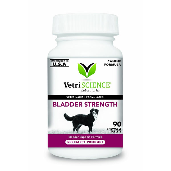 Vetri-Science Laboratories' Bladder Strength for Dogs is an advanced combination of ingredients that work together to support normal bladder function and bladder health. It is also recommended for spayed and senior pets to help maintain bladder control. About the formula: Pumpkin seed powder has been used for prostate and bladder health and is beneficial to urinary tract health due to its cleansing action. It also strengthens bladder muscle and supports bladder emptying. Rehmannia glutinosa is a Chinese herb that supports renal function, and healthy levels of estradiol in females and testosterone in males. Wild yam provides phytoestrogens and relaxes urinary tract muscles. Soy protein extract contains isoflavones that provide phytoestrogens to help maintain normal bladder muscle tone that is lost after spaying or due to aging because of lower estrogen levels. Corn silk powder contains polysaccharides and mucilage that can help support urinary tract comfort by fortifying mucosal GAG layers. Saw palmetto extract helps support normal bladder control and muscle tone. Olive leaf extract supports healthy microflora in the G.I. tract. Vitamin B6 supports normal urine output and bladder function.