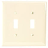 2-GANG TOGGLE POLYCARBONATE WALL PLATE - Molded from non-flammable Polycarbonate. Virtually unbreakable, with high structural rigidity, long-term form retention and superior impact and abrasion resistance. Screw-catch feature holds mounting screws captive and simplifies installation. Matching sc rews provided. High gloss finish is soil resistant. Extra deep. Size: 4-15/16 x 4-7/8.