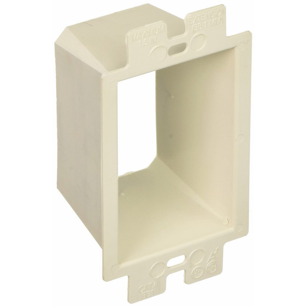 Adjusts up to a 1-1/2" box extension, Functions with all standard devices, switches, and GFCI's, Non-conductive plastic for safer installations, Neutral color, Flexible plastic trims easily for multiple gang boxes, Ideal for installations where wall surface has additional drywall, tile or paneling, Dimensions: 2.313" x 4.188" x 1.813.