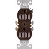 Standard grade straight blade duplex receptacleFeature longer, wider straps providing 40-Percent more contact area to wall boardPatented built-in wire stripper for No.14 and No.12 wire to speed installationTri-combo screws accept slotted, Phillips and robertson-head tools for installation flexibilityAvailable in brown color; measures 2/3-Inch length by 1-1/3-Inch width by 4-1/5-Inch height