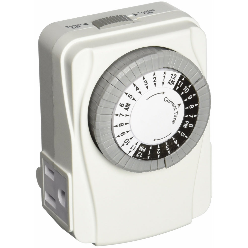 With 24 hour repeat cyclePush down pins are extremely easy to operateOn off top mount override switch to easily bypass programmingCompatible with cfl, led, fluorescent and incandescent bulbsPower Zone electromechanical timer, heavy duty, indoor, 125 v, 15 a, 1875 w power, 24 hr. time setting, white, 2 outlet, 3 conductor.