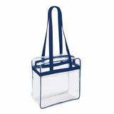 Clear Tote Bag with 35" Long Shoulder Straps and Side Pocket - Navy TrimMeets stadium guidelines for 12x12x6 clear bags and PGA Tournament guidelinesTop zipper closure - No logoMeasures 12"W x 12"H x 6"DClick on Clear Handbags & More to visit our storefront for more colors and styles