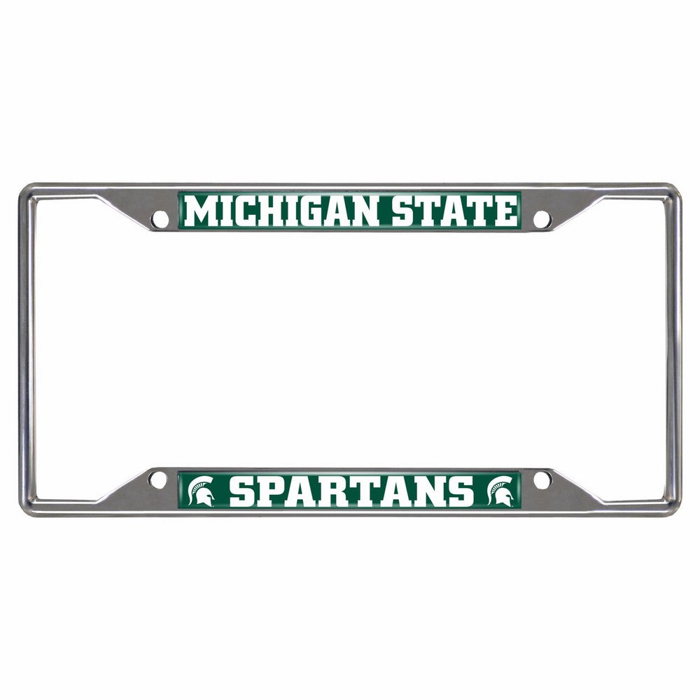 FANMATS Michigan State University License Plate Frame is the perfect way to accessorize your car or truck and show team pride. Goes perfectly with the mirror and metal style license plates. Crafted from durable, long lasting chrome metal - it resists the elements regardless of the weather. Features an eye-catching display of your team name and logo in true team colors. Fits perfectly around the team inlaid license plate or around your state issued license plate. Each frame measures approximately 12.25 inches long by 6.25 inches tall. Customize your ride and announce your team spirit with pride.