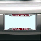 Officially Licensed NCAA ProductChrome Metal License Plate FrameLaser-Cut Mirrored Acrylic InsertsHand Inlaid Mirrored AcrylicMade in USAChrome Metal License Plate Frame with Inlaid Mirrored Acrylic InsertsBrand: Stockdale, Model: 84959, Color: Alabama Crimson Tide