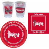 Buy this Party Pack and SAVE $These party supplies provide all the essentials to entertain your friends and family with a Nebraska Cornhuskers themed celebration.It contains 25 REUSABLE 10 oz. frosted, flexible cups printed two sides and dishwasher safe. Just the right size for wine, cocktails, punch, kids' beverages or almost any drink, beer not so much. Let your guests take these cups as mementos or keep them and use them again at your next Huskers celebration.Also included 24 9" paper plates and 32 paper luncheon napkinsOfficially Licensed and All made in the USA