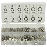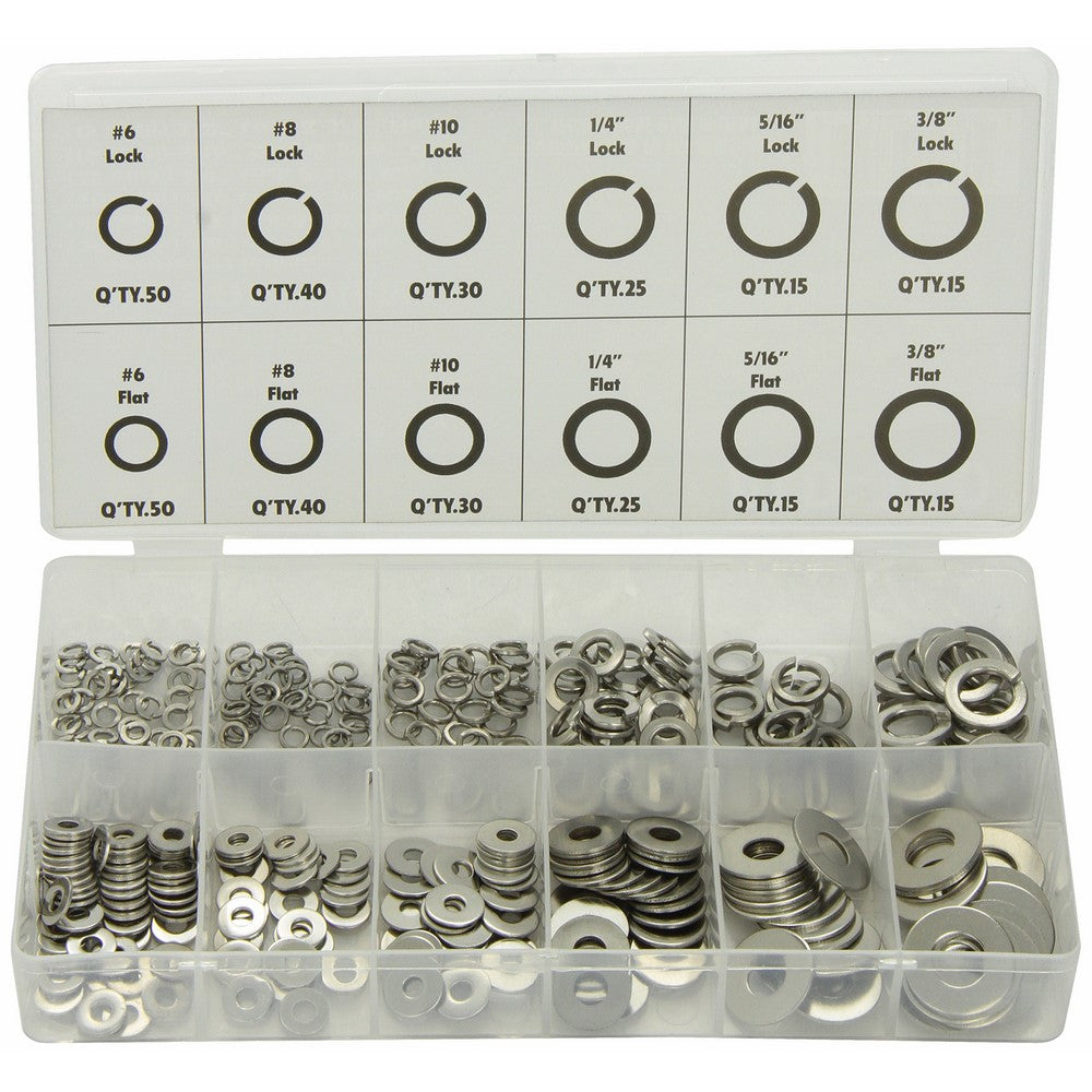 • Contains: (50) #6 lock, (40) #8 lock, (30) #10 lock, (25) 1/4" lock, (15) 5/16" lock, (15) 3/8" lock, (50) #6 flat, (40) #8 flat, (30) #10 flat, (25) 1/4" flat, (15) 5/16" flat and (15) 3/8" flat.
