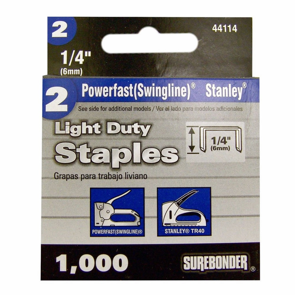 • Surebonder No. 2, 44114, Light Duty 1/4" Leg Length, .500" Crown Staples (Swingline Type) can be used with Swingline Stapler models 101, 10105 and 31100. Will also fit Stanley TR40 and Bostich TG.3 staplers. There are 1,000 steel staples per box.