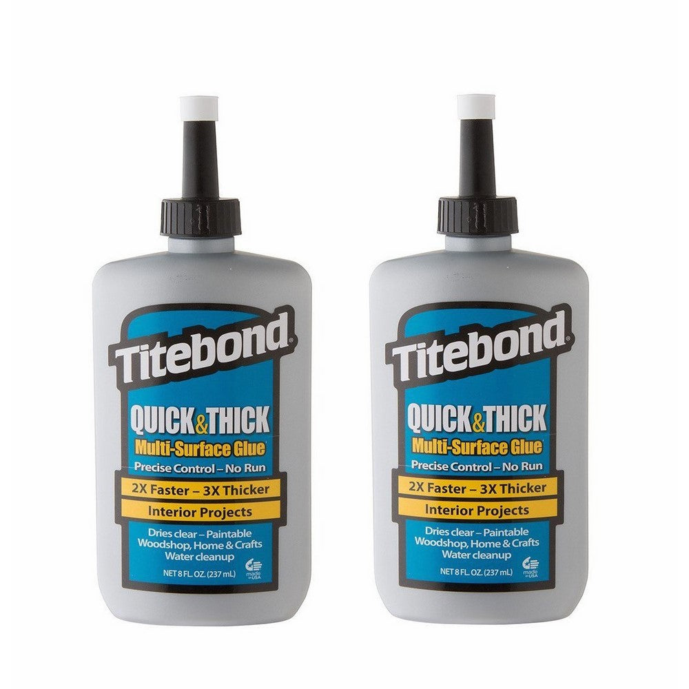 8 OZ, Titebond Quick & Thick Multi-Surface Glue, Thickest, Fastest Drying Glue Available For Use With Porous and Semi-Pourous Materials, Ideal For Finish Trim, Crown Molding, Baseboards, Window Casings and Other Applications Requiring A Professional Streh, No-Run Wood Glue, Provides A Stong Initial Tack and Fast Speed Of Set, Yet Allows Realignment Of Working Pieces, It Develops A Bond Stronger Than The Wood Itself, Excellent Stability and Is Unaffected By Finishes, Easy Cleanup With Water, Nonflammable, No Offensive Odor.