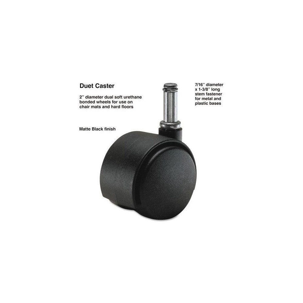 Contemporary design, strength and performance make these replacement casters an excellent choice for office and home furnishings. With appropriate stems and fasteners, each caster can be used on wood, metal and tubular metal chairs, furniture and other equipment. All casters carry the manufacturer's guarantee against defects in material and workmanship. For light to medium duty. Wheels rotate independently. Caster/Glide/Wheel: Dual 2" Casters; Color: Matte Black; Stem Type: C; Weight Capacity (text): 100 lbs. Per Caster.