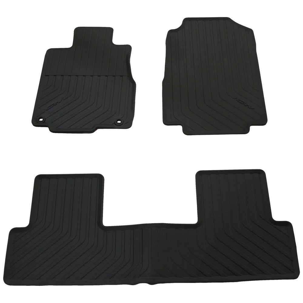 Help protect your Honda's original factory carpet with durable all-weather mats. The mats feature a ribbed channel design that helps contain moisture, dirt and other debris. Retention clips (on the driver's side) and nibbed backing on all mats help hold them in position. Designed to help protect from dirt, mud, snow and slush, the all-weather floor mats feature a multi-dimensional surface, custom channel design and perimeter lip that combine to keep clothing and shoes clean, dry and stain-free. All-weather floor mats are custom-fitted to the vehicle's interior and front mats are embellished with a custom molded vehicle logo. The mats also feature an aggressive "nib" backing and positive retention clips (front driver only) to help prevent sliding. Heavy-duty rubber construction is easy to clean. Color: black. Wet boots, muddy shoes, dog hair; no problem. All Season Floor Mats act as a protective layer between nature and your original carpets.