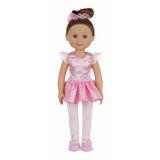14" brunette ballerina dollIncludes removable dance outfit and accessories: pink leotard, tutu, ballet slippers, tights and hair ruffle.Smooth, tangle-resistant hair is brushable and easy to style.Posable arms and legsSweet, baby-powder scent