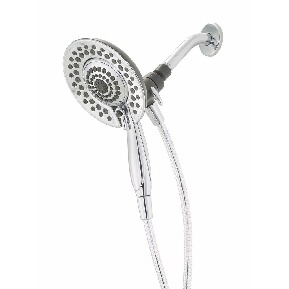 The unique interlocking hand shower and shower head system gives the versatility of a hand shower and the convenience of a shower head, all in one product. The five-spray hand shower offers full massage and trickle sprays to meet every need. Leave the hand shower mounted in the shower for hands-free showering or remove the hand shower for easy rinsing or shaving. Click the integral 3-way diverter for the ultimate showering experience. The diverter operates the shower head spray only, the hand shower only or both at one time. The unit features a 6' flexible hose for added reach when cleaning the tub or shower.
