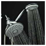 Use each shower head separately or both together!Choose from 30 full and combined water flow patterns6-Setting 6-inch Rainfall Shower Head and 6-Setting 4-inch Hand ShowerSettings of each shower include: Power Rain, Pulsating Massage, Hydrating Mist, Rain/Massage, Rain/Mist and Water-Saving Economy RainHigh-Power Precision SpiralFlo dial design, 3-Zone Click-Lever Dial with Rub-clean JetsPatented 3-Way Water Diverter with Anti-Swivel Lock NutAngle-adjustable Overhead Bracket , 5-ft. Super Flexible Stainless Steel Hose with Conical Brass Hose Nuts for easy hand tighteningTools-free Installation. Connects in minutes to any standard overhead shower arm, no tools required