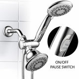Superior Power, Mobility and Flow Control!Use each shower separately or both together! Choose from 30 Full and Combined water flow patterns6-setting 4-inch Shower Head and 6-setting 4-inch Hand Shower. Each shower features High-Power 3-zone Spiral Click-lever Dial with Rub-Clean JetsSettings of each shower include: Power Rain, Pulsating Massage, Hydrating Mist, Rain/Massage, Rain/Mist and Water-saving Economy RainConvenient Patented ON/OFF Pause Switch on HandlePatented 3-way Water Diverter with Anti-swivel Lock Nut with Angle-Adjustable Overhead Bracket5-ft. Super Flexible Double-reinforced Stainless Steel HoseConical Brass Hose Nuts for easy hand tighteningTools-Free Installation. Connects in minutes to any standard overhead shower arm, no tools required