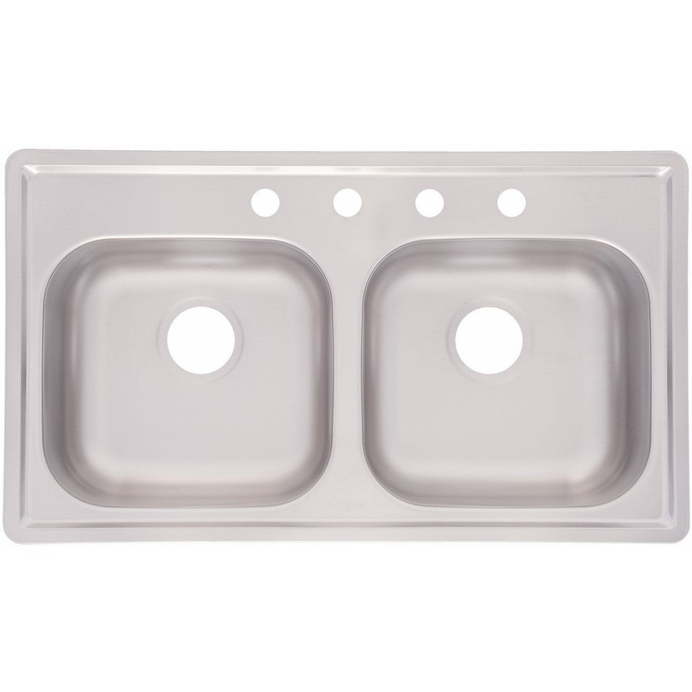 • The FrankeUSA FMSB654NB 33x19in. Top mount Sink is made of 22 gauge stainless steel. This is a double bowl sink. FrankeUSA Sinks are known for their superior patented no-welding production techniques, high quality, and ease of install. This sink features a satin deck and bowl finish. The drains are located in the rear of the bowls. The sink has 4 holes for your faucet and other accessories. This FrankeUSA sink has sound deadening pads which provide ultra-quiet insulation from excess noise and vibrations. The minimum cabinet size for this sink is 36". Our Safe-T rims protect you from sharp edges during installation and adds strength to the sink! Franke Kindred FMSB654NB 6.5" Satin Finish Double Bowl Top mount Mobile Home Sink