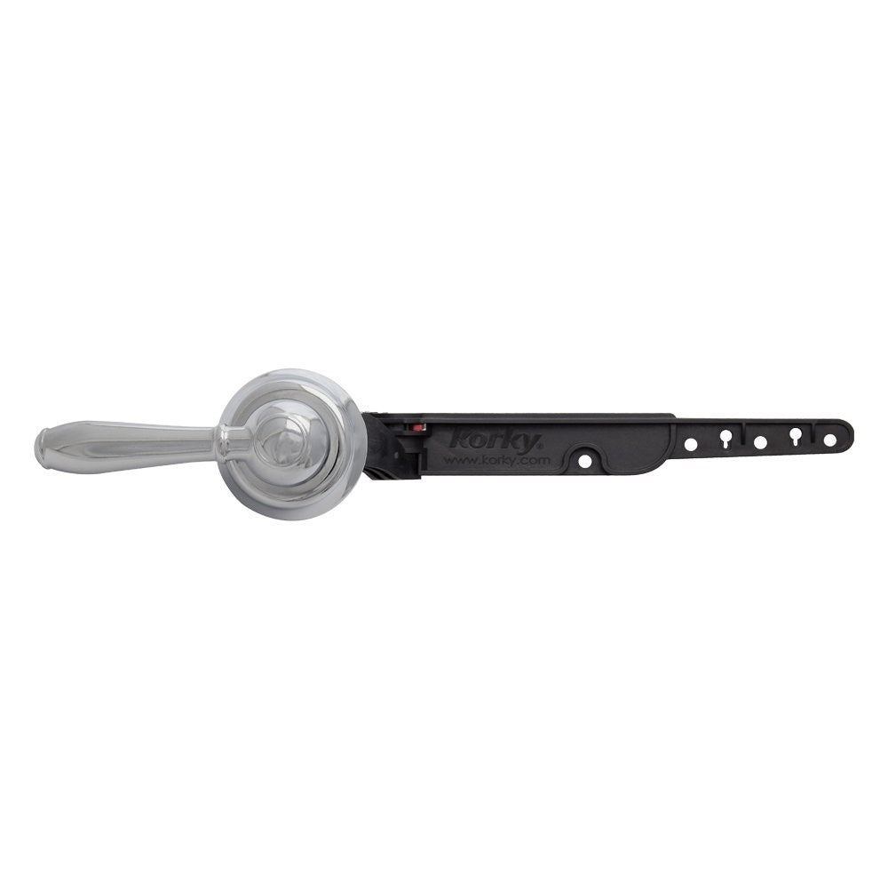 Designed to fit the majority of toilets, the Korky StrongARM Handle & Lever easily adjusts to fit all tank positions including: front, side, angle, right and down. Optimized for use with both 2” & 3” flappers and canister-style flush valves, the engineer grade material in common stress areas performs as well as brass and aluminum levers. The StrongARM lever is adjustable to eliminate the need to bend for fitment and fits most popular brands, including American Standard, Kohler, TOTO & others. The faucet style handle, in a chrome finish, is a great way to upgrade any toilet and compliment the bathroom's decor. Easy to install, the 6051 includes: (1) Chrome Handle, (1) Tank Lever Arm, (2) Locking Clips and (1) Stainless Steel Lanyard Hook.